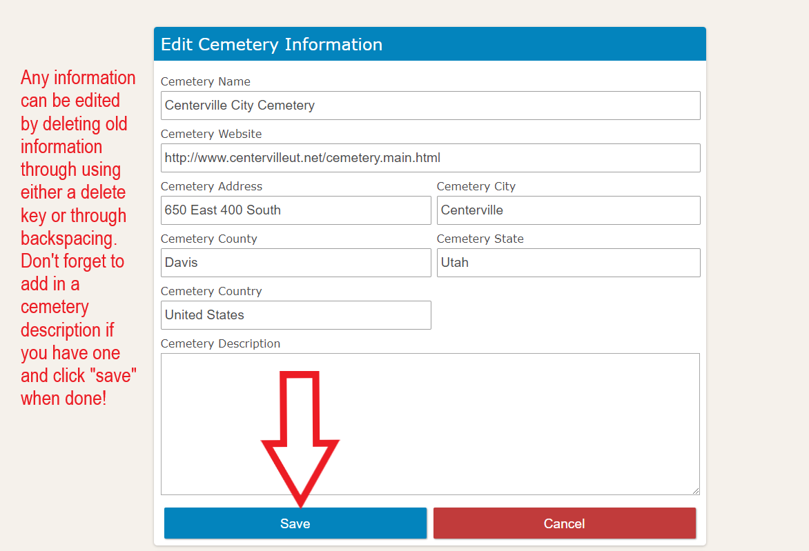 #5 Add a Cemetery Description (optional). If there are multiple names for the same cemetery, add them here.