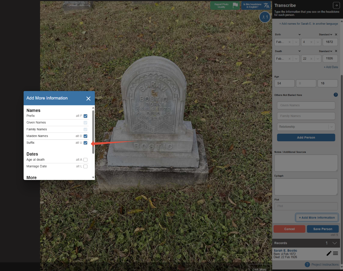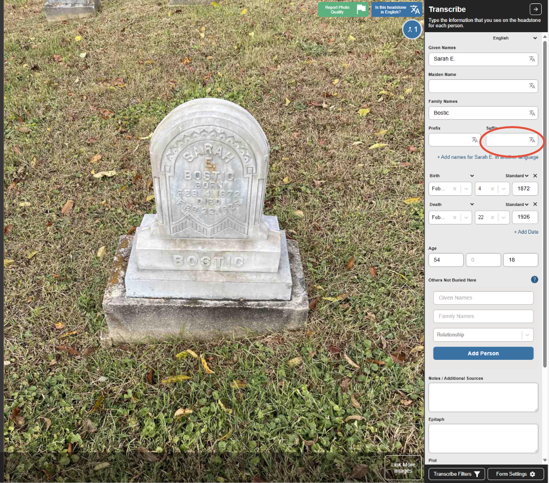 Step 1: To add a suffix, to the transcription currently being worked on and all future transcriptions in this session, choose the "form settings" box under the transcription form. Once chosen, the suffix box will appear under the family names box on the transcription form each time you transcribe an image.