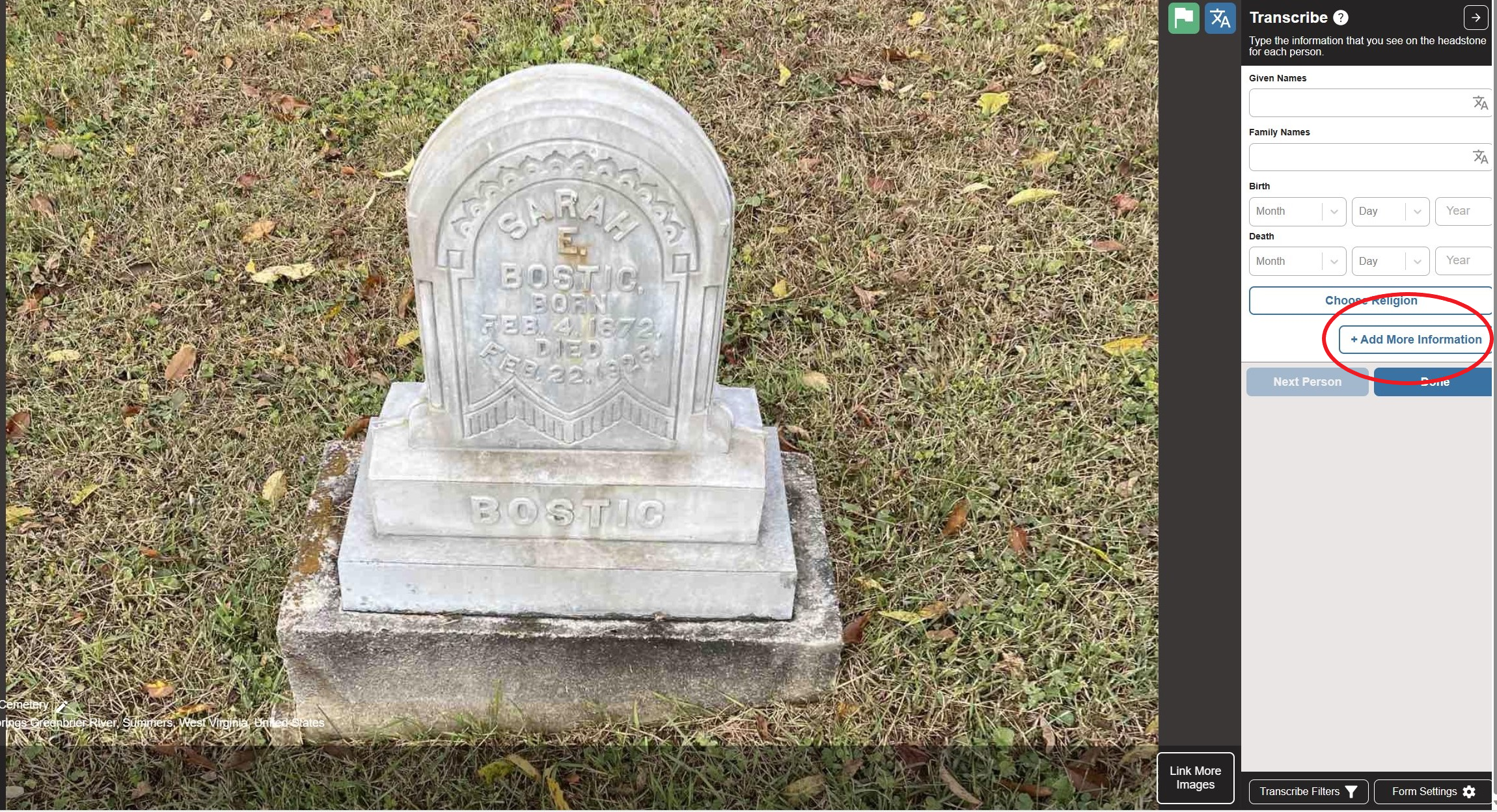 Step 1: To add a suffix to the transcription in the current form only, choose the "add more information" button. Once chosen, in this format, it will appear at the top of the transcription form for the current transcription.