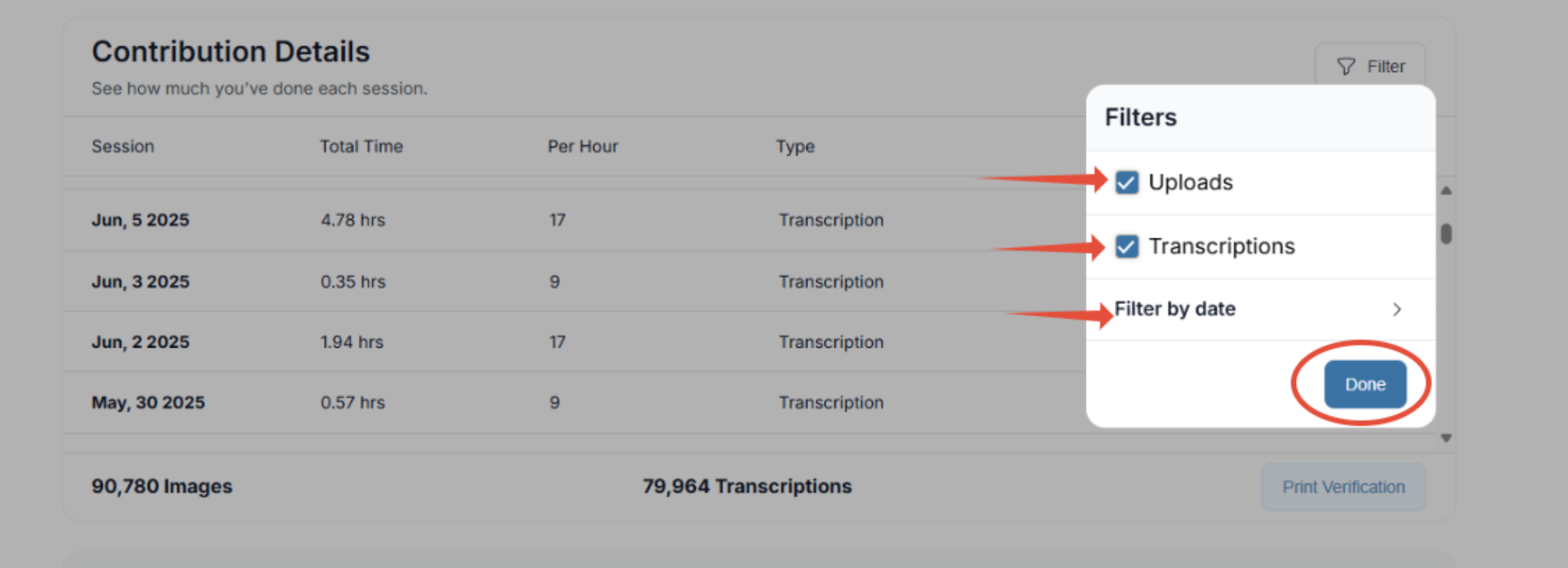 Step 2: Scroll down to Contribution Details and filter the results of what type of certificate you are in need of. These can be filtered by uploads, transcriptions or both, and can be filtered by date. When you are finished with date and filtering types click done and it will create your certificate.