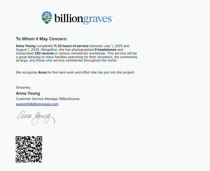 Step 4: A screen will appear with a QR Code to verify your certificate. This will certify the work you have done for BillionGraves.