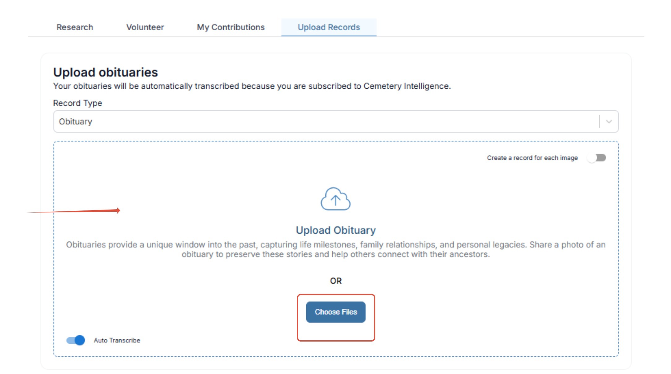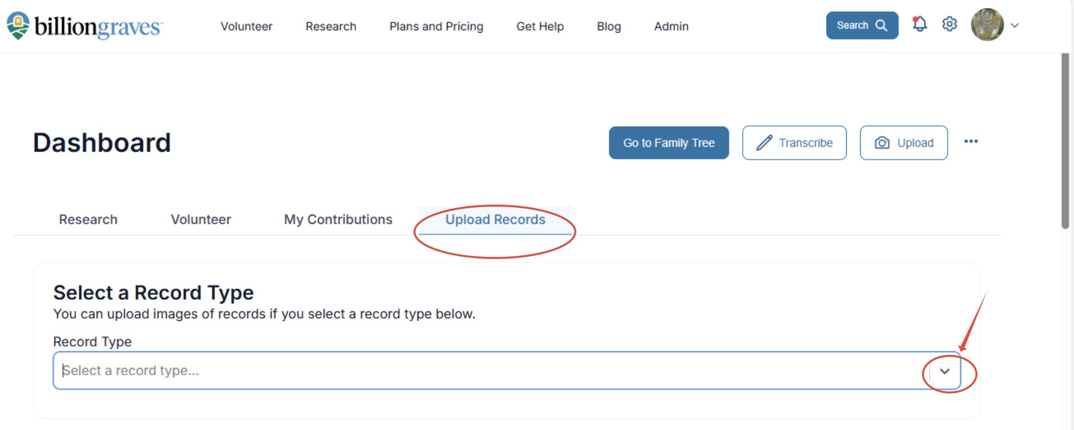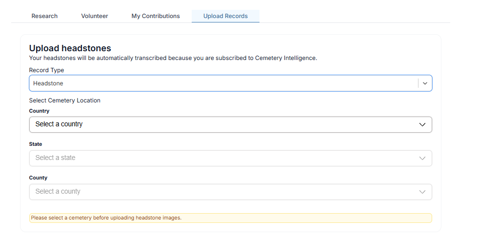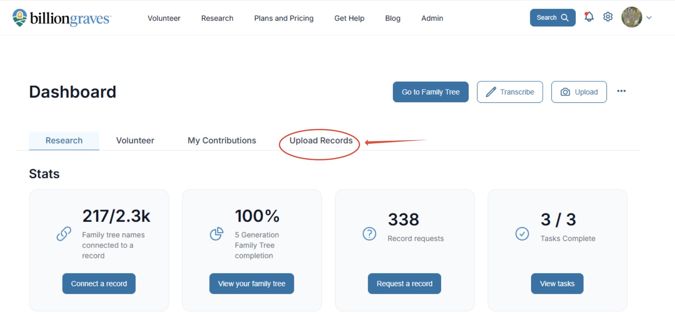 Step 1: On the BillionGraves Dashboard choose the Upload Records tab.