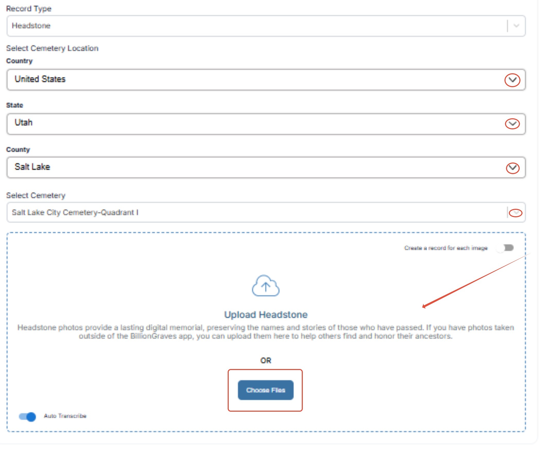 Step 4: If this is a headstone photo taken outside of the app, fill in all of the boxes to place the stone in the correct location.