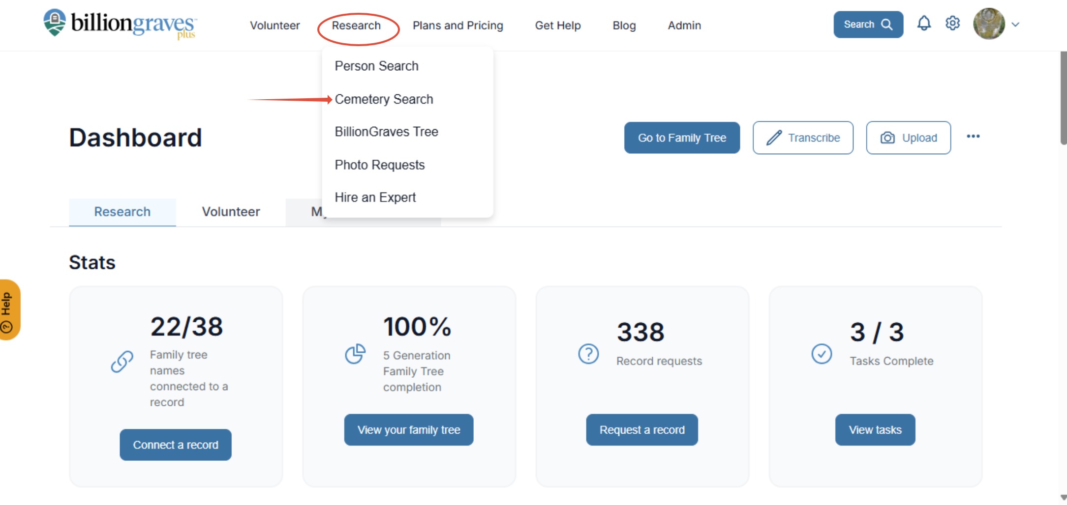 Step 1: Click on the Research tab at the top of the page. Choose the Cemetery Search dropdown.