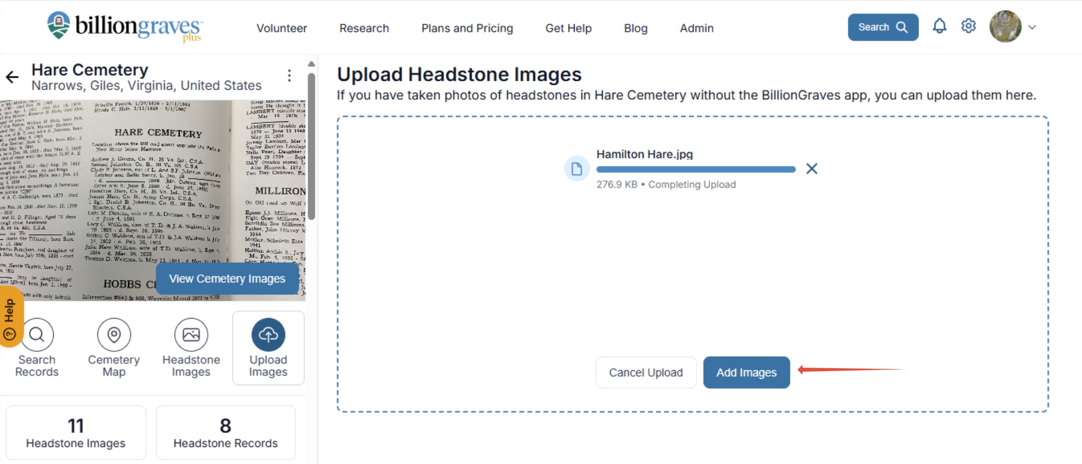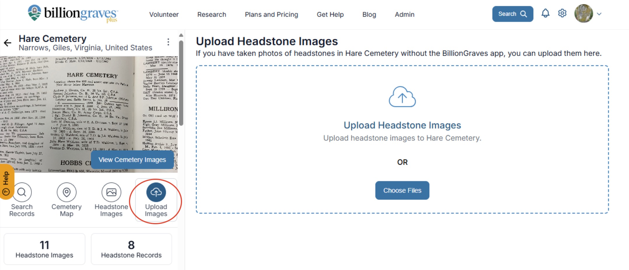 Step 2: Find the cemetery the photos belong in by entering the name and location. When the correct cemetery displays in search results click on it.