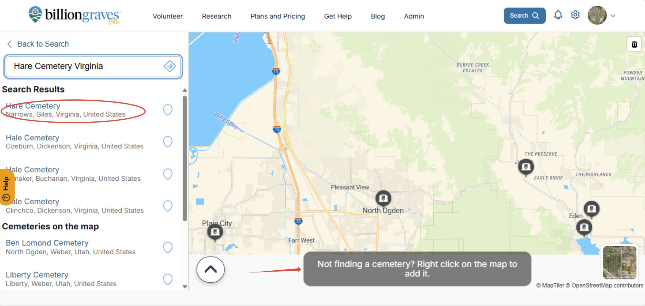 (If the cemetery isn't found in the search results, find the cemetery location on the map. Right click on the map to add it to the database. The cemetery will need to be approved by our staff before it can be viewed by the public.)