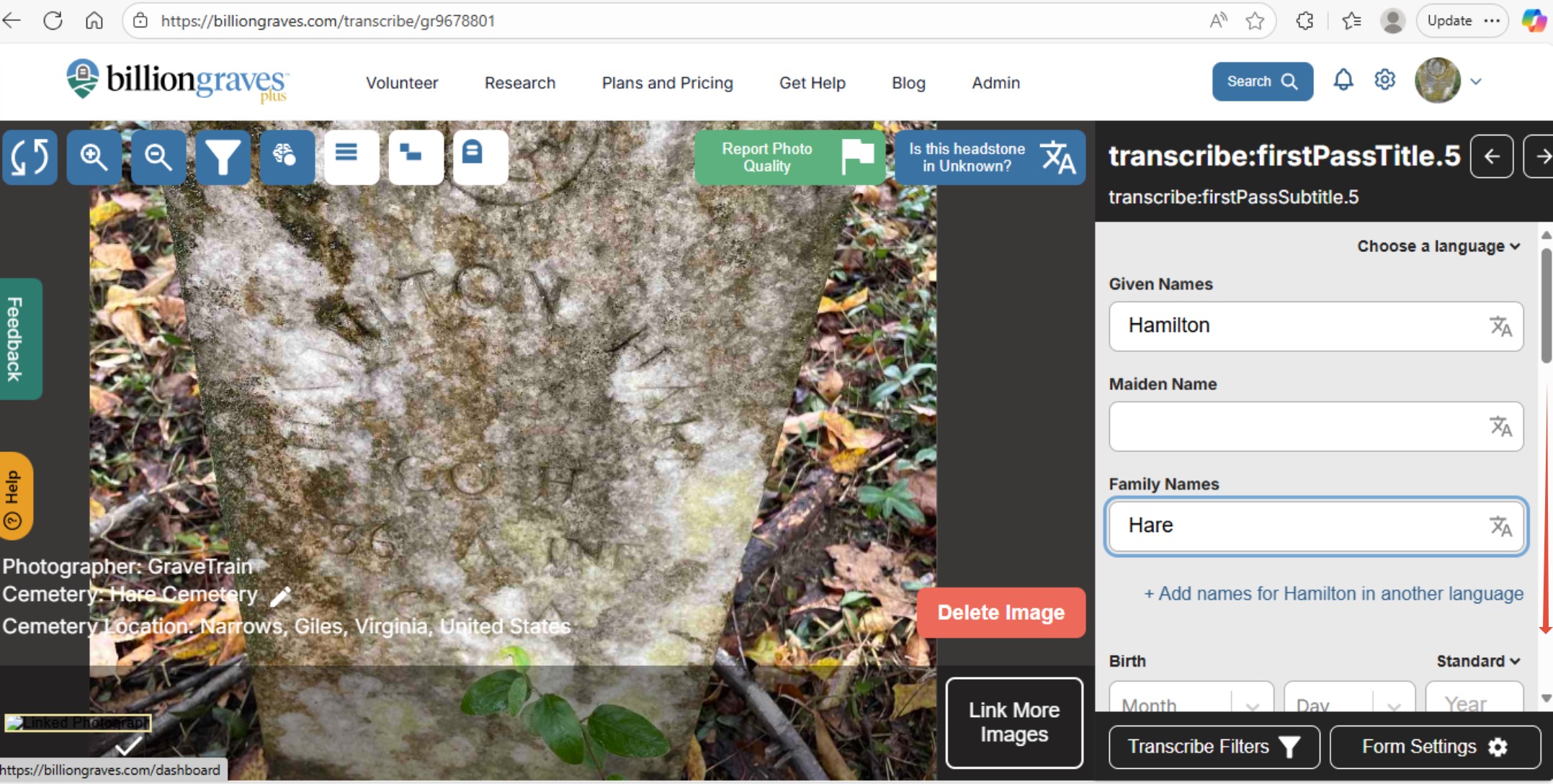 Step 7: Transcribe the image, and click "Save Person" at the bottom of the form.