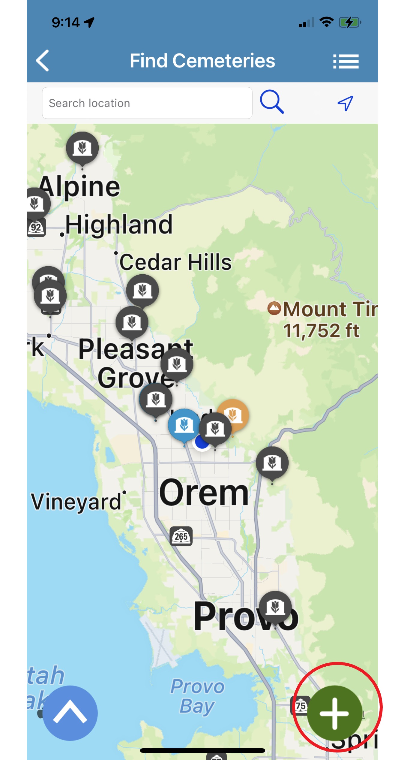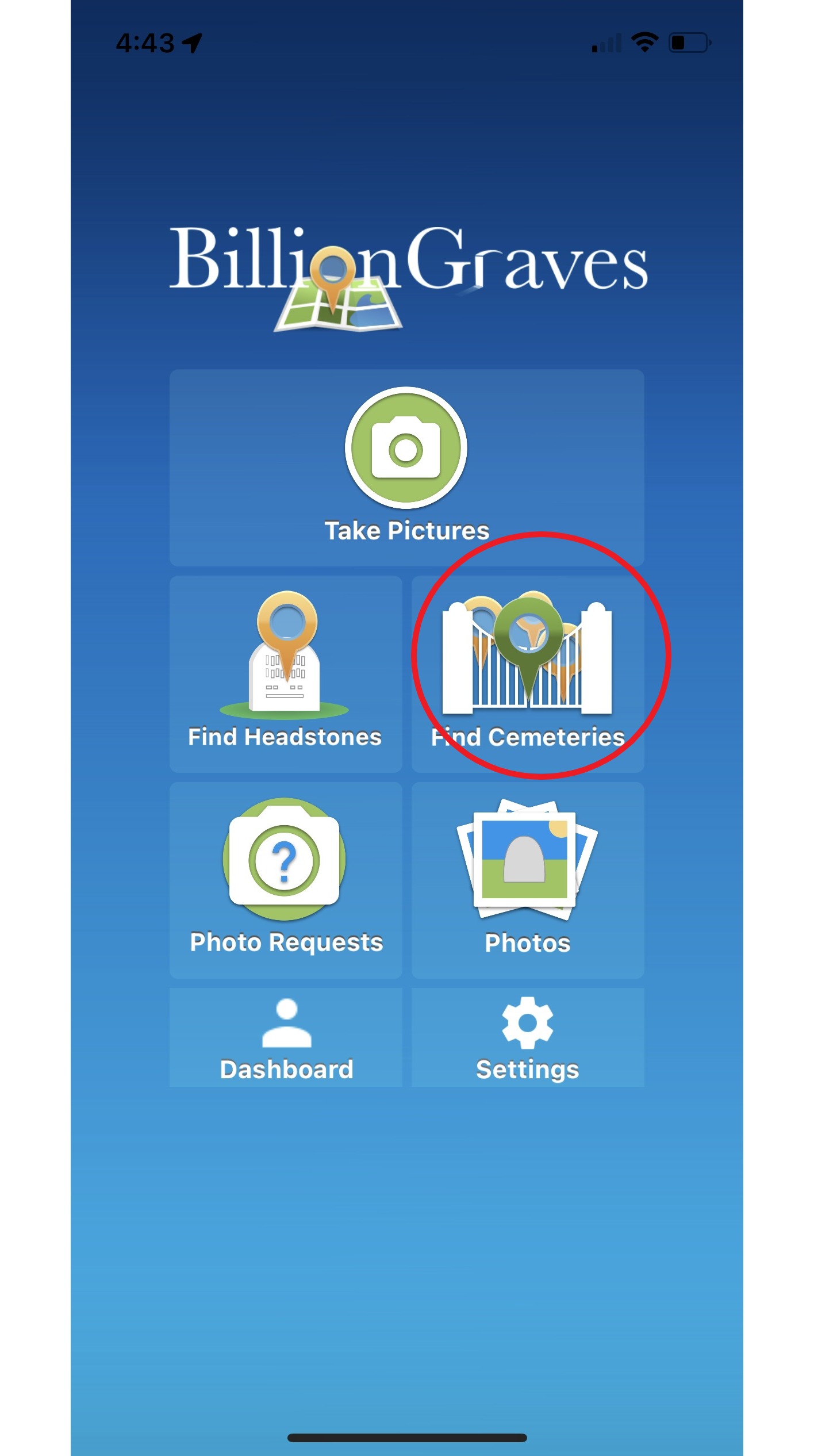 Step 2: Tap on Find Cemeteries.